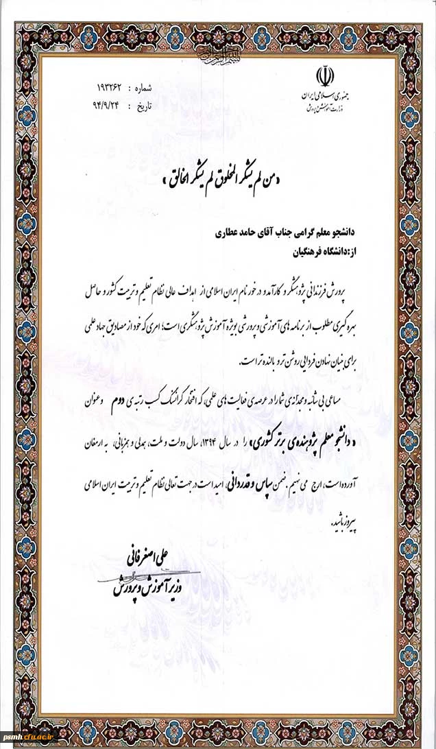 تقدیر وزیر محترم آموزش و پرورش دکتر علی اصغر فانی از دانشجو معلم جناب آقای حامد عطاری