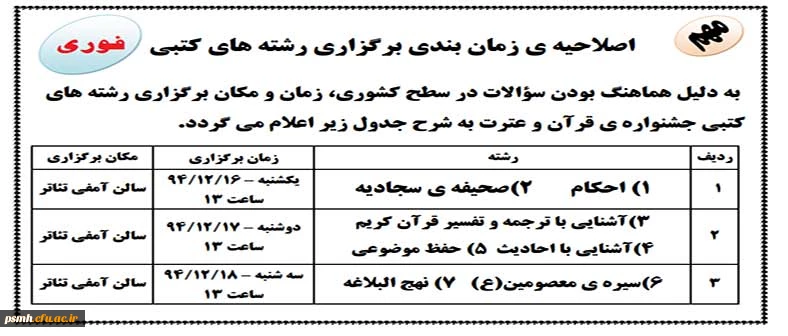 امتیاز دهید : اصلاحیه ی زمان بندی برگزاری رشته های کتبی بیست و ششمین جشنواره فرهنگی شنبه 15 اسفند 1394 ساعت 16:13