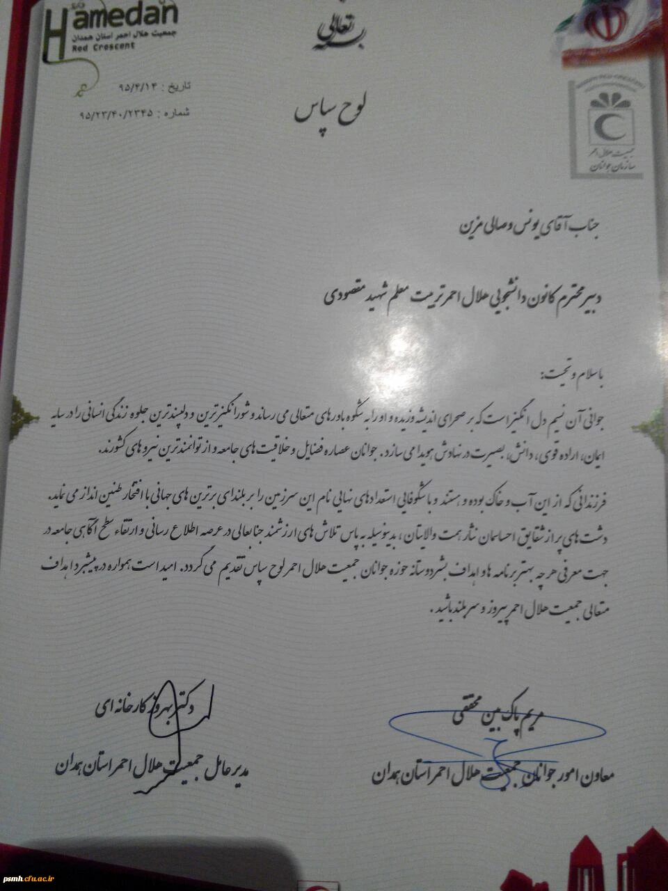 تقدیر مدیرعامل جمعیت هلال احمر استان همدان از طرح های ابتکاری دبیر کانون دانشجویی هلال احمر پردیس شهید مقصودی
