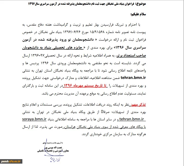 فراخوان بنیاد ملی نخبگان جهت ثبت نام دانشجو معلمان پذیرفته شده در آزمون سراسری سال 1396