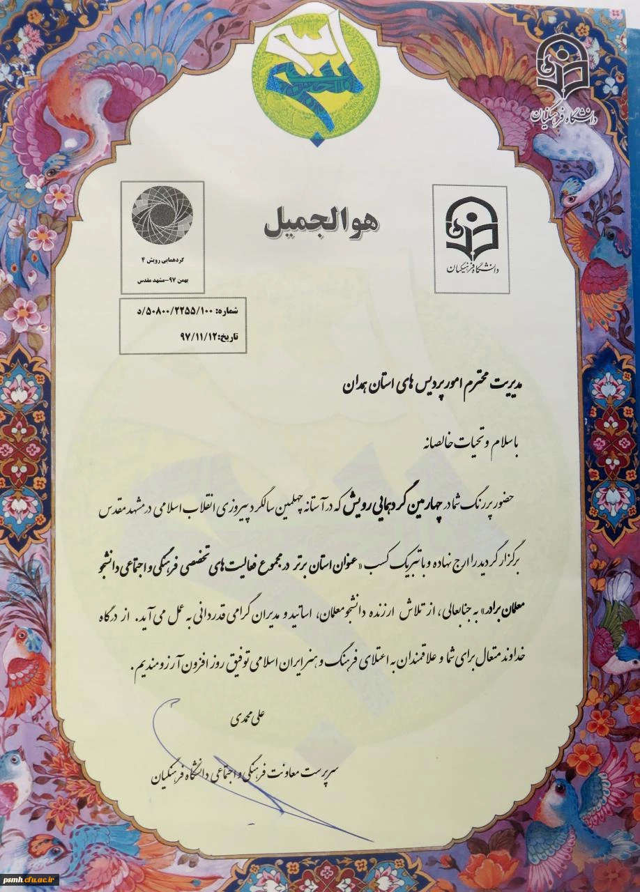 کسب رتبه ی برتر در بخش فعالیت های تخصصی فرهنگی و اجتماعی دانشجومعلمان پردیس شهید مقصودی همدان در گردهمایی کشوری رویش/ بهمن ماه97، مشهدمقدس