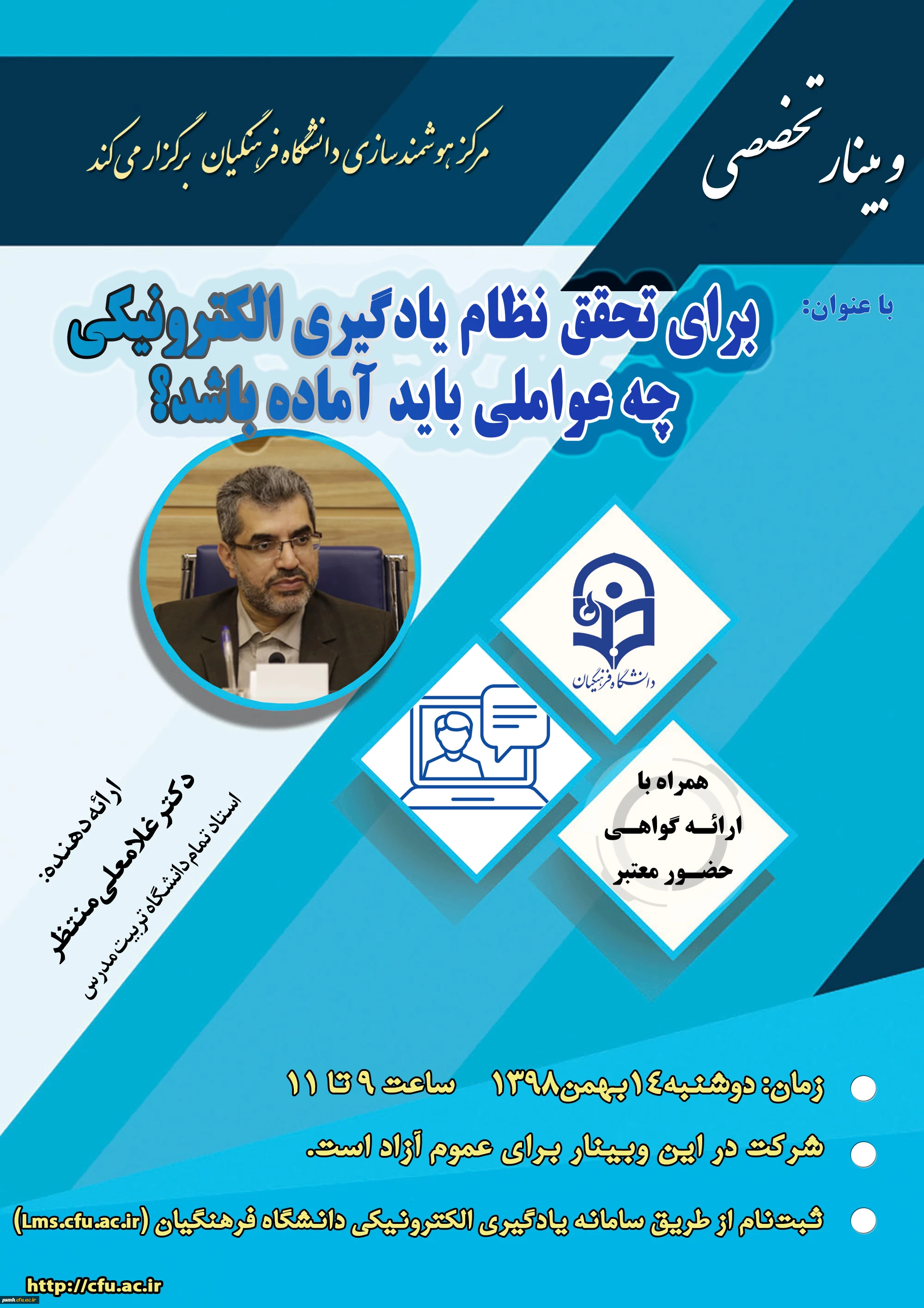 23اُمین وبینار مرکز هوشمندسازی توسط جناب آقای دکتر غلامعلی منتظر، استاد دانشگاه تربیت مدرس تهران، تحت عنوان «برای تحقق نظام یادگیری الکترونیکی چه عواملی باید آماده باشد؟»