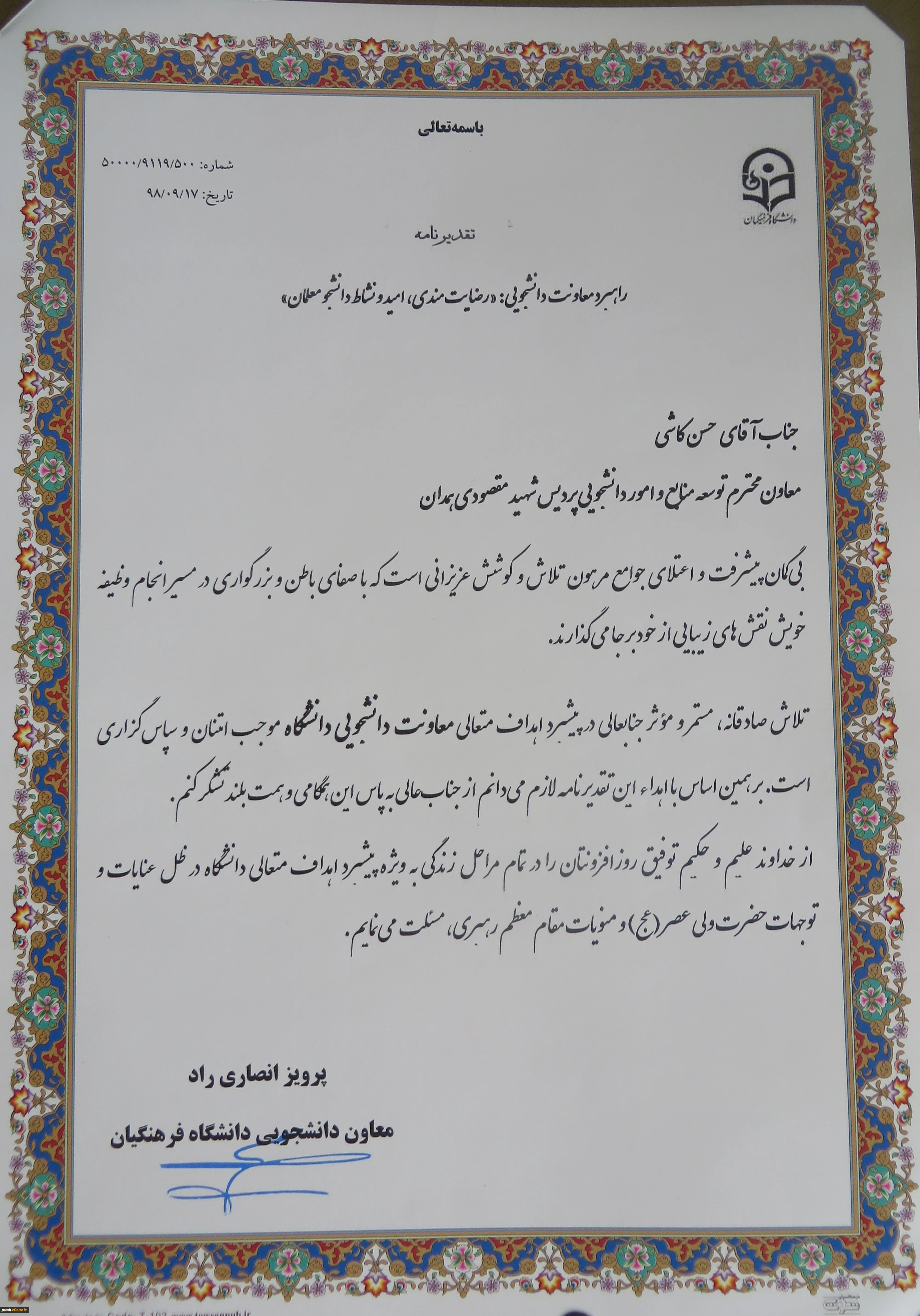 امتیاز دهید : تقدیر از زحمات معاون توسعه منابع و امور دانشجویی پردیس شهید مقصودی همدان 2 یکشنبه 4 اسفند 1398 ساعت 9:23