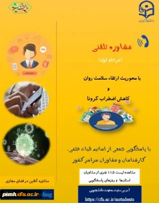 امتیاز دهید : پوستر برنامه مشاوره تلفنی با موضوع ارتقاء سلامت روان و کاهش اضطراب کرونا یکشنبه 21 اردیبهشت 1399 ساعت 11:19