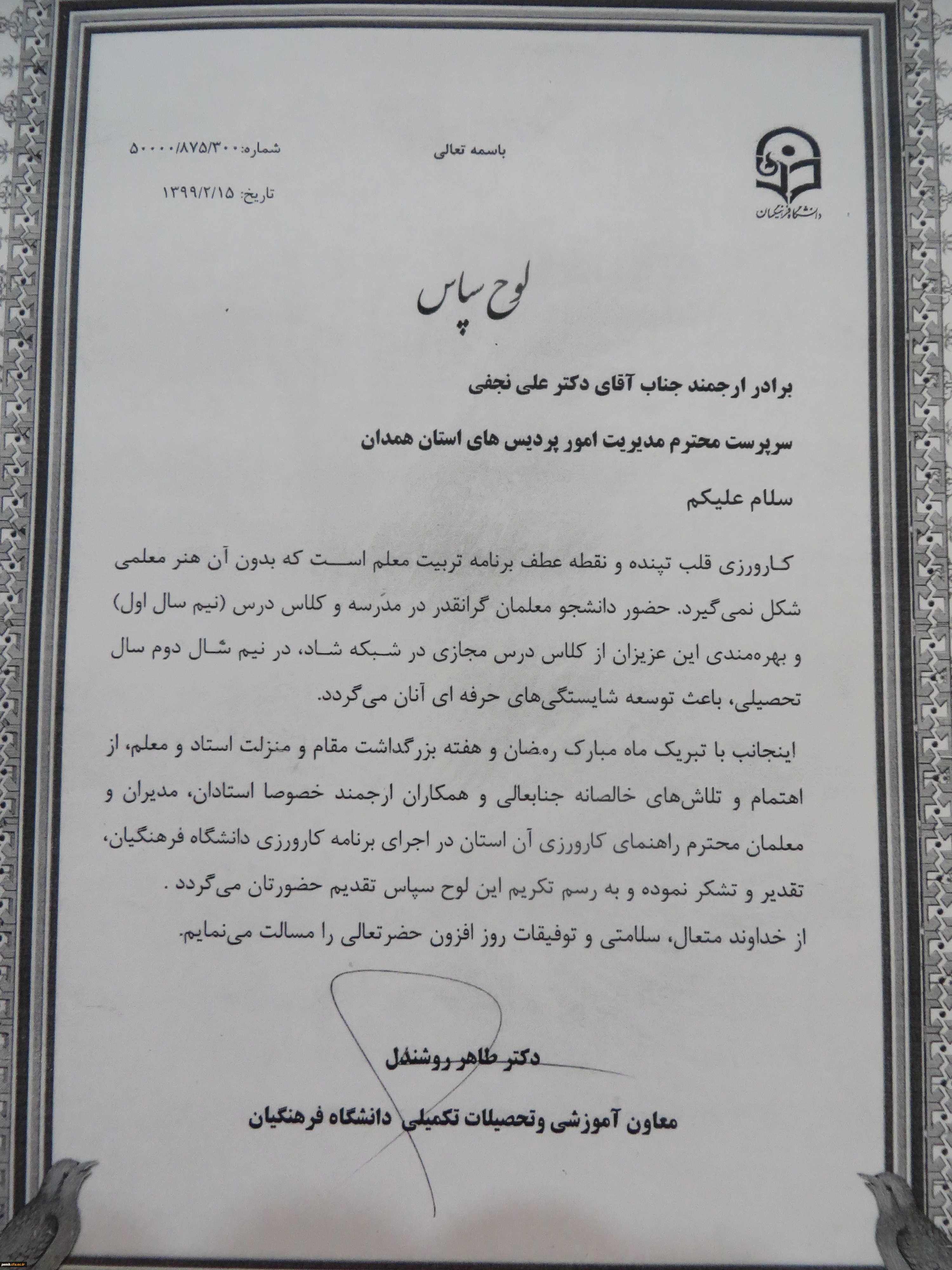 تقدیر معاون آموزشی و تحصیلات تکمیلی دانشگاه فرهنگیان از مدیریت امور پردیس های استان همدان 2