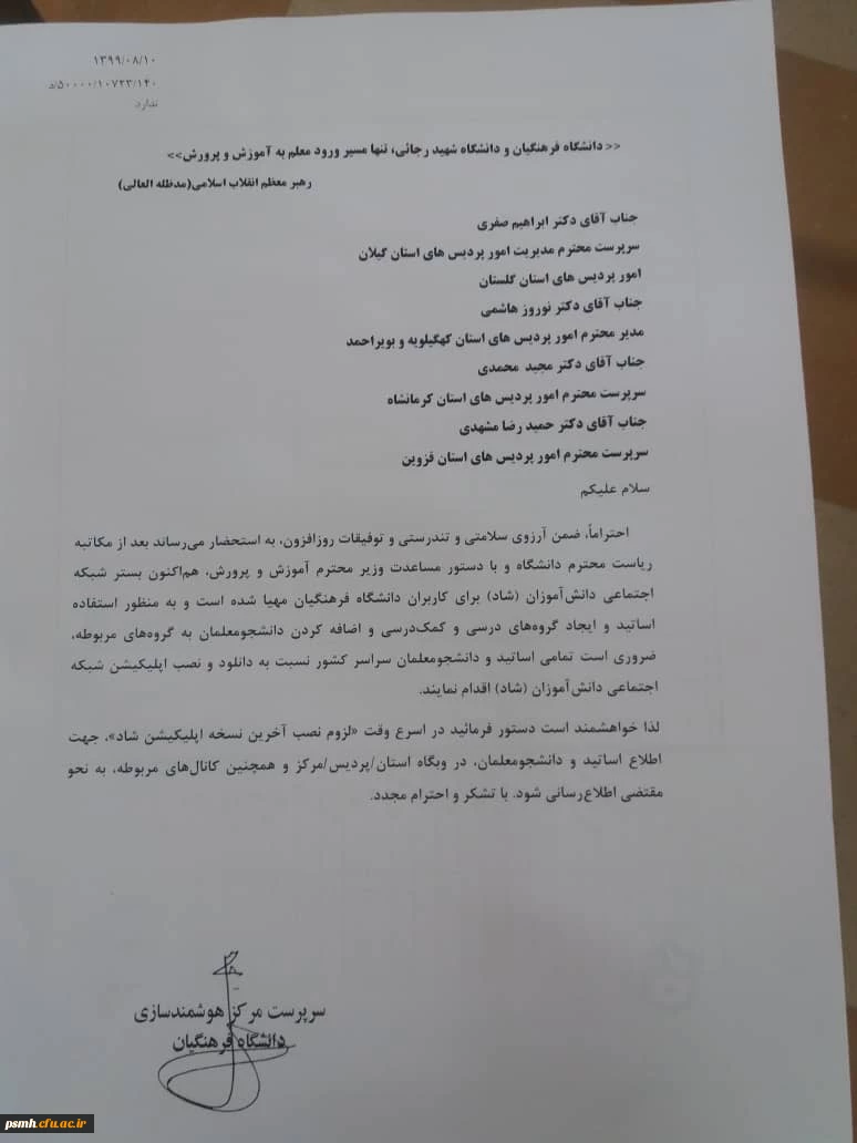 امتیاز دهید : نامه ارسالی دانشگاه فرهنگیان در خصوص بحث کارورزی و عضویت در اپلیکیشن شاد 2 یکشنبه 18 آبان 1399 ساعت 12:54