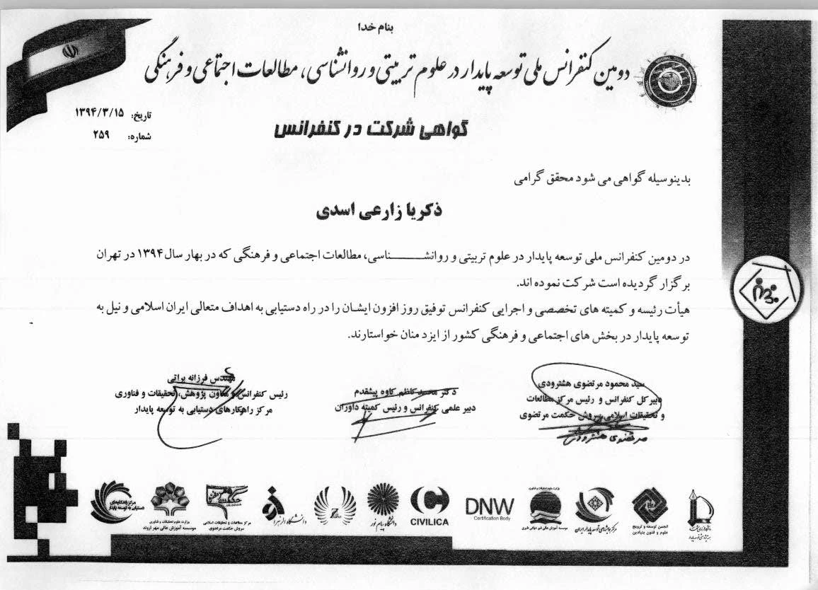 گواهینامه های ارایه ی مقاله ی دانشجو ذکریا زارعی اسدی